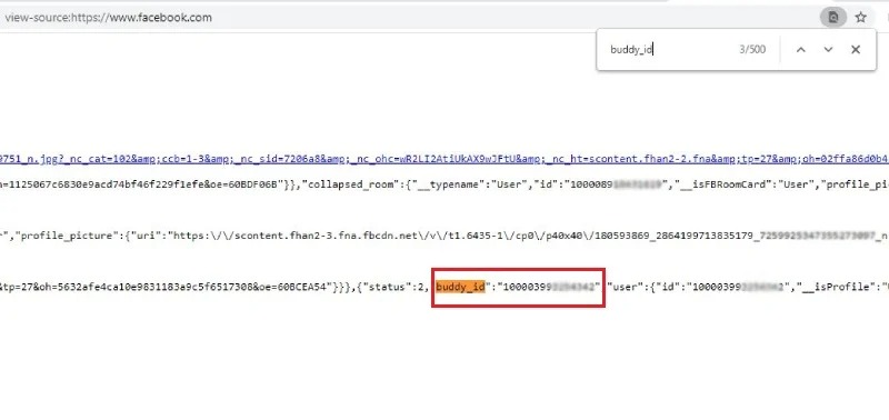 Khi này, bạn sẽ được nhìn thấy giao diện chứa mã nguồn của Facebook. Hãy nhấn tổ hợp phím Ctrl + F để mở thành tìm kiếm. Nhâp từ khóa buddy_id. Kết quả sẽ hiện ra 1000xxxxx.