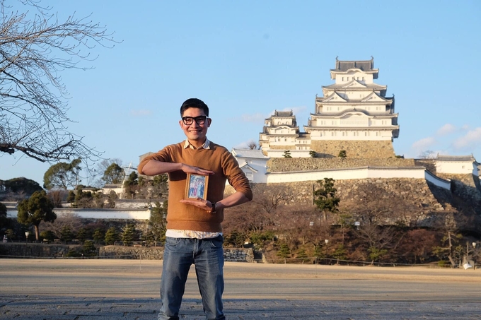 "Nếu một ngày nào đó bạn không thể thấy cha mẹ mình nữa, điều bạn muốn làm nhất là gì?", đó là cách anh Lê Đức Nhân, sinh năm 1993, quê Bình Định bắt đầu câu chuyện của mình khi kể về hành trình "Ba má ơi, mình đi đâu tiếp?" tại Nhật Bản. Trên ảnh là Nhân trước Himeji, toà lâu đài được UNESCO công nhận là di sản văn hoá thế giới tại tỉnh Hyogo.