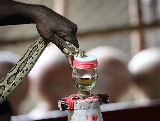 Công việc lấy nọc rắn vô cùng nguy hiểm và ẩn chứa nhiều rủi ro. Họ phải dùng tay mở miệng, cắm răng chúng vào chiếc lọ có màng mọc và lấy nọc.