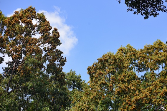 Mỗi quả có 2 cánh nhỏ, chỉ chờ gió đến là sẽ phát tán tạo nên vũ điệu tuyệt đẹp như chong chóng xoay. Những quả dầu bay còn được gọi vui là món quà của gió. Ảnh: Nguyệt Nhi