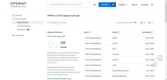 Metadefender cho phép bạn upload một file APK để file đó có thể được quét bởi nhiều công cụ antivirus khác nhau. Đối với các file APK ở dạng tệp nén, chúng sẽ được trích xuất tự động để thực hiện quy tŕnh quét trên từng tệp riêng lẻ bên trong. Tuy nhiên, quá tŕnh quét toàn bộ tệp APK chưa được trích xuất cũng sẽ được thực hiện. Người dùng chỉ cần kéo và thả các tệp của ḿnh vào công cụ quét, và một báo cáo sẽ được tổng hợp chỉ sau vài giây.
