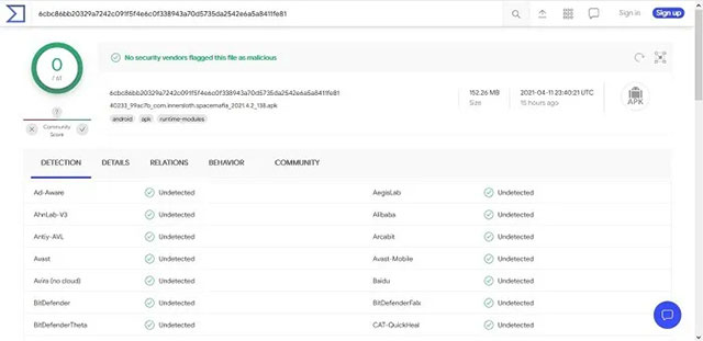 VirusTotal là một giải pháp tuyệt vời khác mà bạn có thể trải nghiệm. Công cụ này có khả năng phân tích toàn diện file APK và giúp phát hiện gần như tất cả các loại virus cũng như phần mềm độc hại phổ biến trên internet hiện nay. VirusTotal rất dễ sử dụng: Bạn chỉ cần tải upload các tệp của ḿnh và đảm bảo rằng chúng không có lỗi. Ngoài ra, bạn cũng có thể sao chép-dán URL trong VirusTotal, hoặc sử dụng chức năng t́m kiếm để kiểm tra địa chỉ IP, miền hoặc băm tệp.
