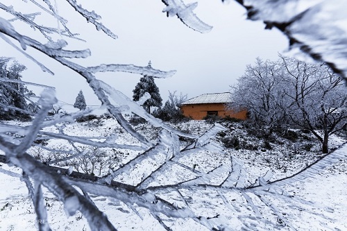 Anh Nhân cho biết đầu tháng 1/2021, khi nghe tin có đợt không khí lạnh tràn về vùng cao Lào Cai nên lên đường săn tuyết, may mắn đón những bông tuyết đầu tiên rơi ngày 10/1 trên khu vực núi Nhìu Cồ San, Bát Xát. Trên hình là ngôi nhà lạnh lẽo giữa mùa đông trong đợt tuyết rơi trắng xóa ở Nhìu Cồ San.