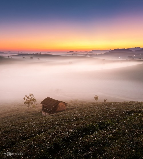 Một căn nhà nhỏ nằm trên đồi chè ở Tân Lập, Mộc Châu, Sơn La. Vào mỗi sớm mai, màn sương lảng bảng trên những nương chè trải dài tít tắp gây ấn tượng du khách.