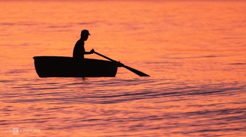 Ngư dân một mình chèo thuyền thúng giữa biển nước mênh mông lúc bình minh ở vùng biển Bình Minh, Thăng Bình, Quảng Nam. Chợ cá ven biển này bắt đầu trở nên nhộn nhịp lúc hừng sáng. Khi tàu thuyền vừa cập bến, các thương lái đến nhận phần tôm cá và chở đến các chợ.