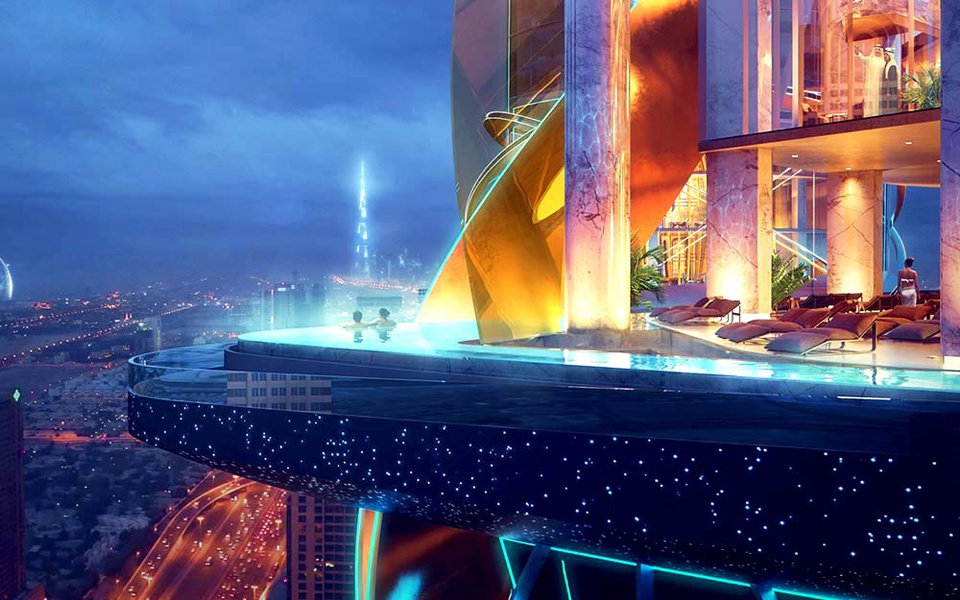 Bể bơi trên cao trong khách sạn đầu tiên trên thế giới có rừng (UAE): Tổ hợp khách sạn và chung cư siêu sang Rosemont ở Dubai gồm hai tòa tháp 47 tầng. Nơi đây có rừng nhiệt đới với nhiều loại cây quý hiếm, hồ và bãi biển nhân tạo ở giữa rừng. Ngoài ra, khách sạn còn có bể bơi trên cao. Công trình có kết cấu nhô ra và bao quanh tòa nhà độc đáo. Ảnh: Reader's Digest.