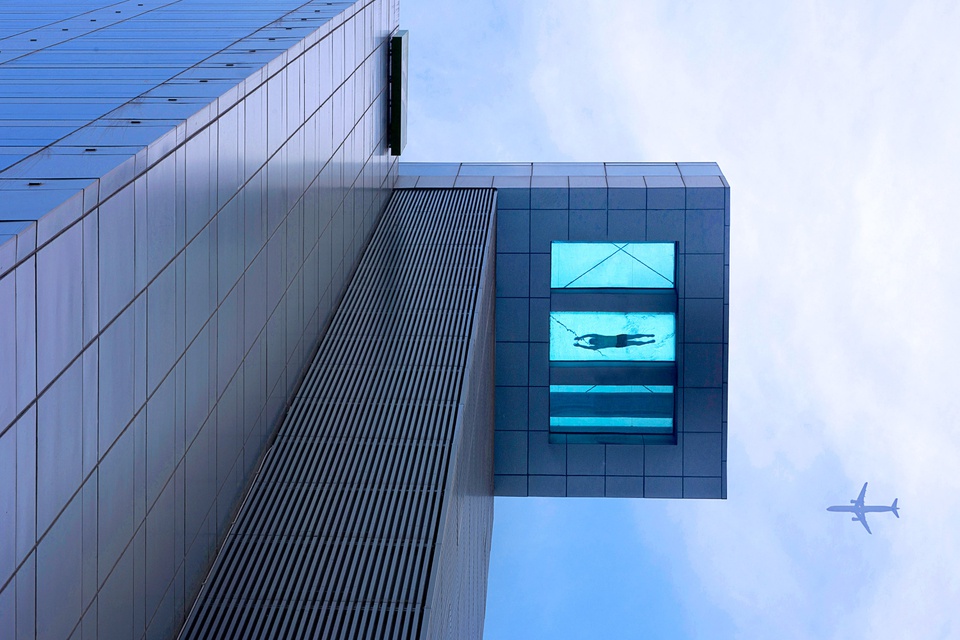 Hồ bơi đáy kính trên cao (Trung Quốc): Khách sạn Holiday Inn tại Thượng Hải sở hữu bể bơi ở tầng 24. Một phần của hồ bơi có đáy bằng mặt kính, cách mặt đất khoảng 70 m, đem đến cho bạn cảm giác đang bơi trên không trung và cơ hội nhìn xuống đường phía dưới. Phần còn lại của bể dài 30 m nằm phía trong tòa nhà. Ảnh: Pinterest.