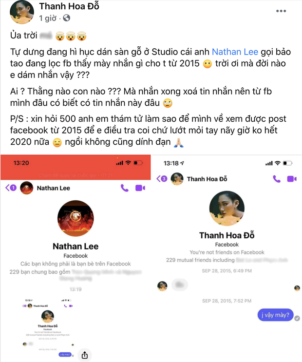 Nhân vật nữ này tỏ ra vô cùng ngỡ ngàng khi bị Nathan Lee “đào” lại những tin nhắn nội dung thô tục gửi từ tài khoản Facebook của cô cách đây 6 năm.