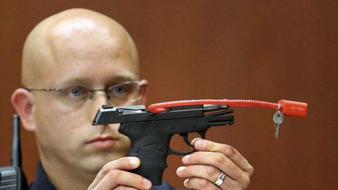 Kẻ giết người George Zimmerman cầm khẩu súng mà hắn đã dùng để bắn Trayvon Martin.