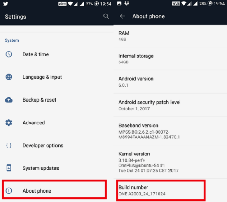 Bước 2: Trên điện thoại ban vào About phone => Build Number 7 lần để mở khóa các tùy chọn.