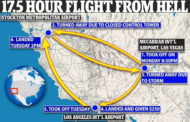 Sau khi cất cánh từ Las Vegas vào 20h30 ngày 12/7 (giờ địa phương), chuyến bay dự kiến sẽ hạ cánh xuống Stockton vào 21h30. Khi bay đến Stockton, phi công không thể nhận tín hiệu từ kiểm soát không lưu trên mặt đất để nhận báo cáo thời tiết. Chia sẻ với CBS, Jade Watts, một hành khách trên chuyến bay mô tả cảm xúc "hoàn toàn kinh khủng" khi phi công xuất hiện và nói rằng tháp kiểm soát không lưu đã đóng nên họ không thể hạ cánh nếu không có báo cáo thời tiết.