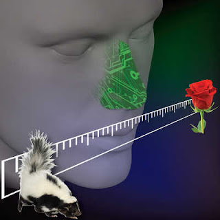 Một cái mũi điện tử eNose được hiệu chỉnh theo trục khứu giác đi từ mùi dễ chịu (như hoa hồng) đến khó chịu (mùi con chồn hôi). Ðiều này cho phép eNose chọn được mùi mà con người cảm thấy sảng khoái. (Hình: GeniBrodsky/Wikipedia)