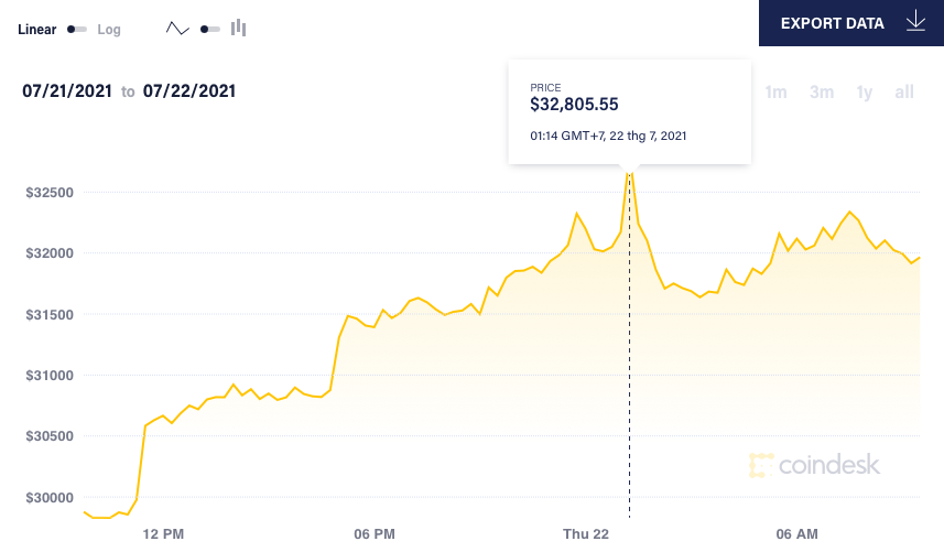 Theo dữ liệu của Coin Desk hôm 22/7, giá Bitcoin tăng mạnh 7,47% so với một ngày trước đó lên 31.956 USD/đồng. Giá có thời điểm vọt tới 32.800 USD/đồng.