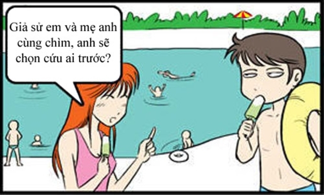 - Mỗi khi con dâu và con trai tôi cãi nhau, cô ấy luôn hỏi con trai tôi: “Nếu mẹ anh và em ngã xuống nước thì anh sẽ cứu ai trước?"