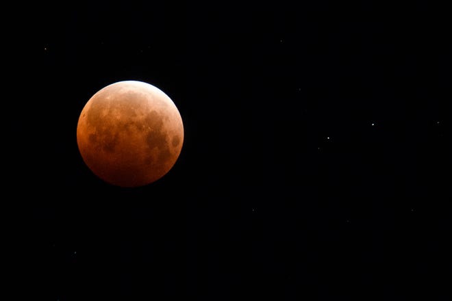 Thông thường, Mặt Trăng chuyển sang màu da cam hoặc đỏ trong thời gian nhật thực, khi Trái Đất che khuất ánh sáng chiếu tới từ Mặt Trời. Khi đó, bầu khí quyển của Trái Đất khúc xạ ánh sáng màu đỏ lên bề mặt của Mặt Trăng, tạo ra hiện tượng trăng máu. Trong ảnh, Mặt Trăng được quan sát có màu cam từ Ontario, Canada. Ảnh: Reuters.