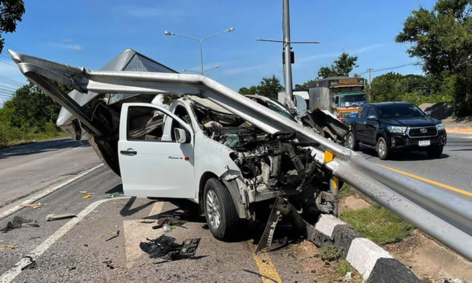 Ôtô gắn camera hành trình đang chạy trên đường Mittraphap, tỉnh Khon Kaen. Tài xế đột nhiên la lớn khi thấy phía làn đường ngược chiều, một xe tải chạy tới điểm giao cắt cùng lúc một xe máy từ đường nhánh lao ra. Để tránh xe máy nhưng không thể phanh kịp, tài xế ôtô tải đánh lái sang phải khiến xe đâm thẳng vào dải phân cách. Xe máy cũng văng ra đường.