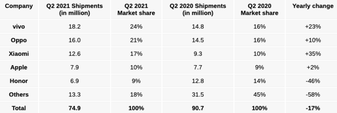 Theo số liệu thị trường smartphone Trung Quốc quư II/2021 do Canalys công bố, tổng số lô hàng smartphone bán ra tại nước này đạt tổng cộng 74,9 triệu máy, giảm 17% so với 90,7 triệu máy trong cùng kỳ năm ngoái. Số lượng công ty xuất xưởng trên 10 triệu máy ra thị trường cũng giảm từ 5 xuống c̣n 3.
