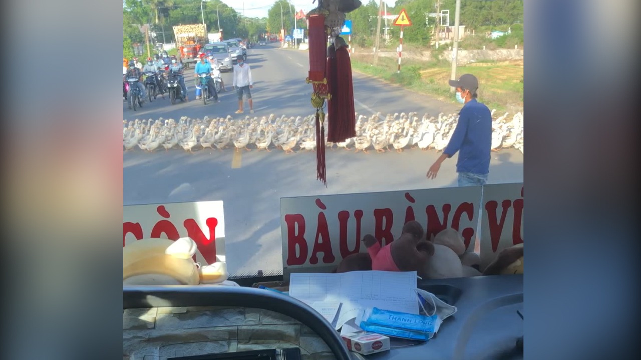 Thấy hàng ngh́n con vịt sang đường, tài xế xe khách và hàng chục chiếc xe máy khác đă dừng lại nhường đường.