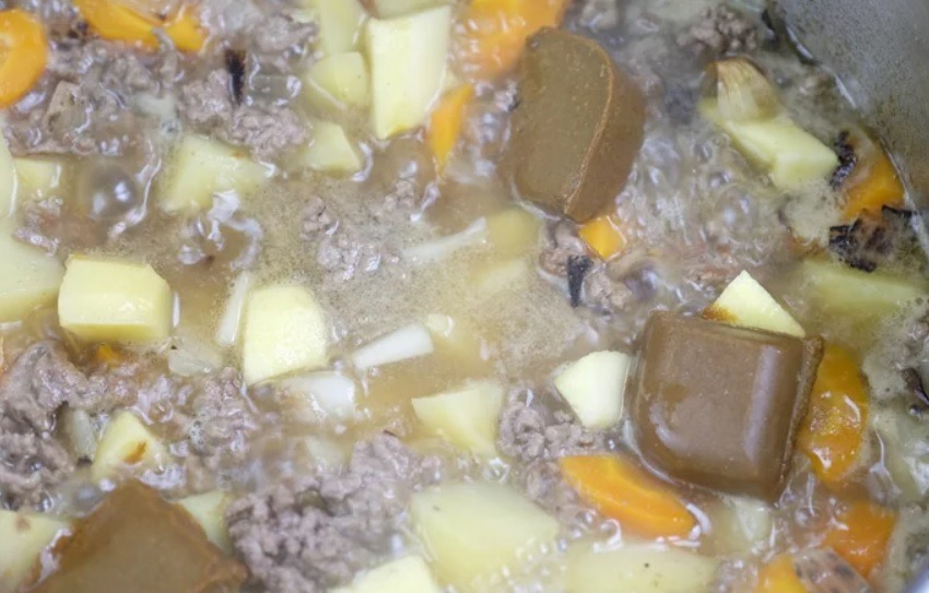 Sau khi tất cả các nguyên liệu trên đã chín tới, hãy thêm viên cà ri vào nồi. Những viên cà ri này là một phần thiết yếu của công thức. Chúng là hỗn hợp bột mì, chất béo, bột cà ri và gia vị được đun nóng và để nguội tạo thành khối đóng gói tiện lợi. Sau khi hòa tan những viên này trong nồi, bạn sẽ có nước sốt cà ri thơm, đặc sánh vô cùng hấp dẫn. Tiếp tục nấu trên lửa nhỏ và khuấy đều trong 10 phút để cà rốt và khoai tây mềm hơn.