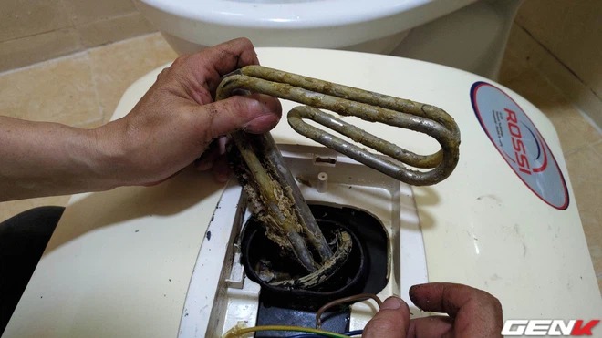Để tháo được thanh đốt thì phải ấn cho nó tụt vào trong, gỡ gioăng cao su bịt kín, sau đó nhấc thanh đốt ra. Thanh đốt bị cặn canxi trong nước bám xung quanh sẽ khiến hiệu suất làm nóng giảm, từ đó khiến cho thời gian làm nóng tăng, gây tốn điện.