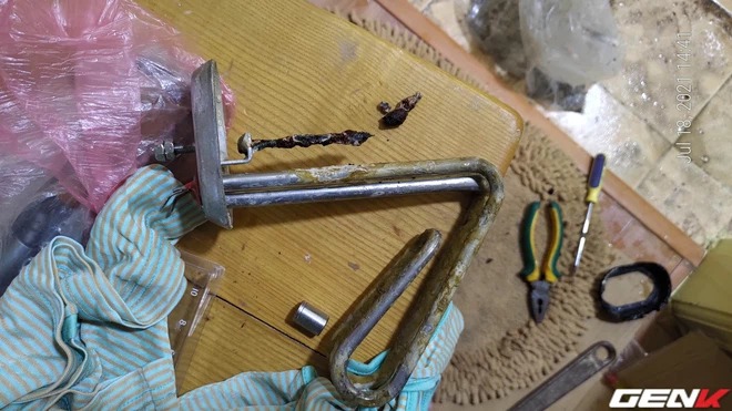 Do đã quá lâu không vệ sinh bảo dưỡng nên trong bình có rất nhiều "dị vật" và chất bẩn, thò tay vào bốc ra được cả nắm như thế này. Đây là những lớp canxi đã từng bám vào thanh đốt, lâu ngày bong ra và rơi xuống đáy bình.