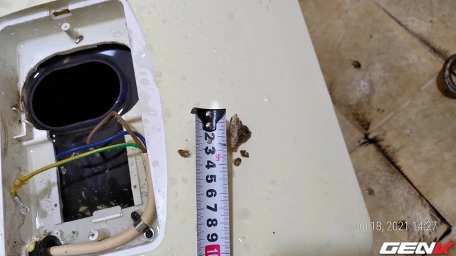 Lúc này bình nóng lạnh thứ 2 cũng đã xả hết nước và được hạ xuống. Bình này cũng được sản xuất vào quý I năm 2008 như bình kia, và về độ bẩn thì cũng không hề thua kém, thậm chí còn có phần nhiều nước đen hơn.
