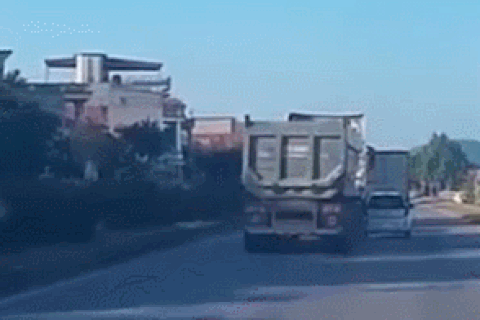 Tài xế chiếc xe ben chuyển làn đường mà không quan sát thấy chiếc xe con đang chạy song song, để rồi gây ra một vụ tai nạn như một cảnh trong phim hành động…