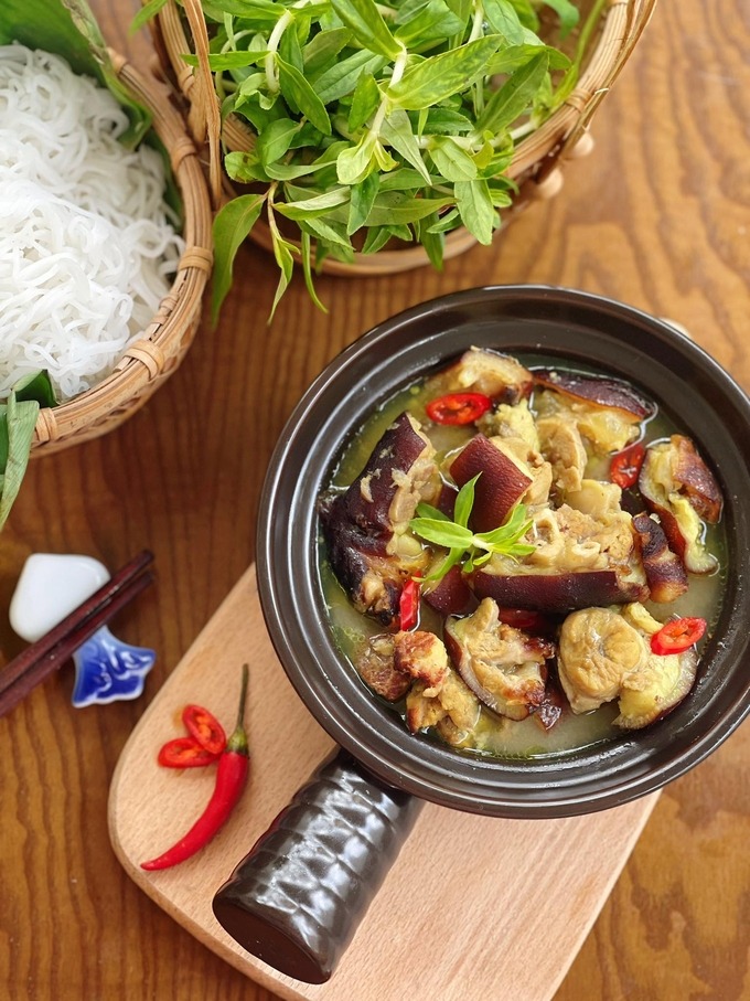 Món chân giò nấu giả cầy được ninh nhừ nhưng không nát, phần da giòn, vương mùi khói được thui tự nhiên.