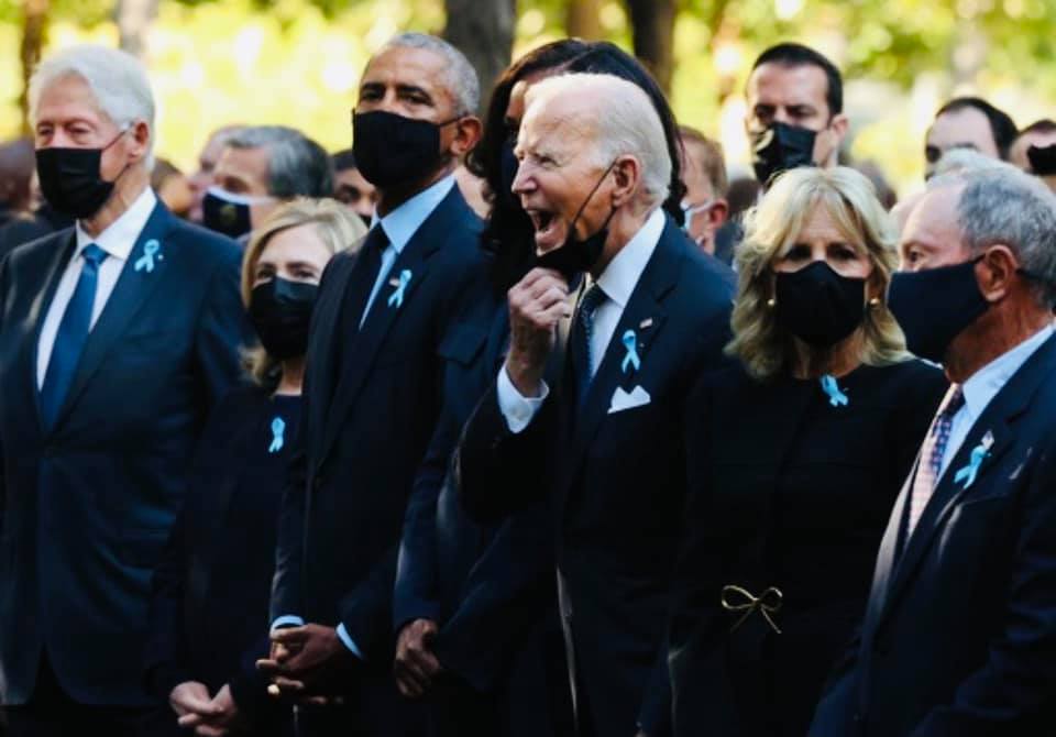 Ảnh: Trong phút trầm mặc nghiêm trang tại lễ tưởng niệm các nạn nhân vụ khủng bố 11/9, Joe Biden đã tháo bỏ khẩu trang để quát tháo một người nào đó. Jill Biden vợ ông ta thì thất thần nhìn vào máy quay vì bà ta biết rằng khoảnh khắc xấu xí của chồng đã không thoát khỏi ống kính truyền thông.