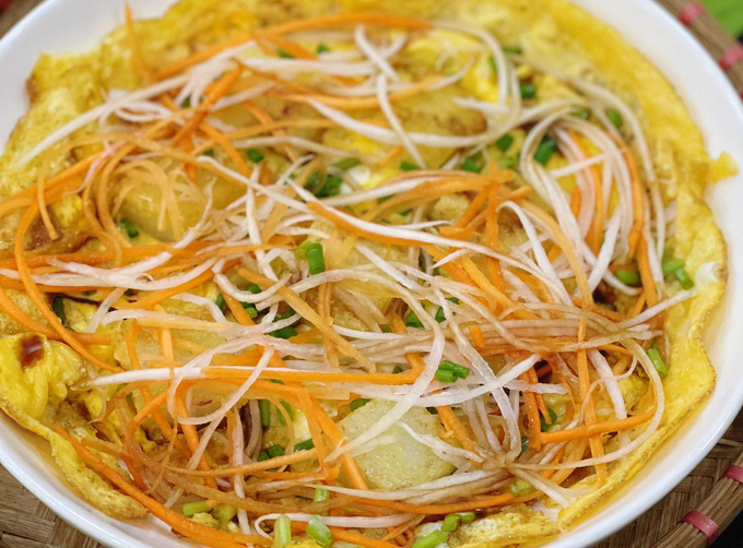 - Bày bột chiên lên đĩa, thêm chút cà rốt, củ cải bào ngâm chua ngọt. Rưới nước chấm lên rồi thưởng thức ngay khi còn nóng.