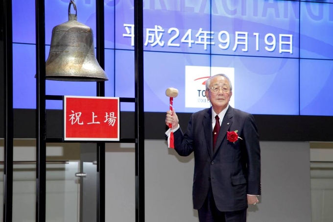 Inamori Kazuo đánh tiếng chuông bắt đầu phiên giao dịch đầu tiên của cổ phiếu Japan Airlines khi hãng này được tái niêm yết trở lại trên sàn chứng khoán Tokyo, tháng 9/2012. Ảnh: Thư viện Inamori/Kyocera.