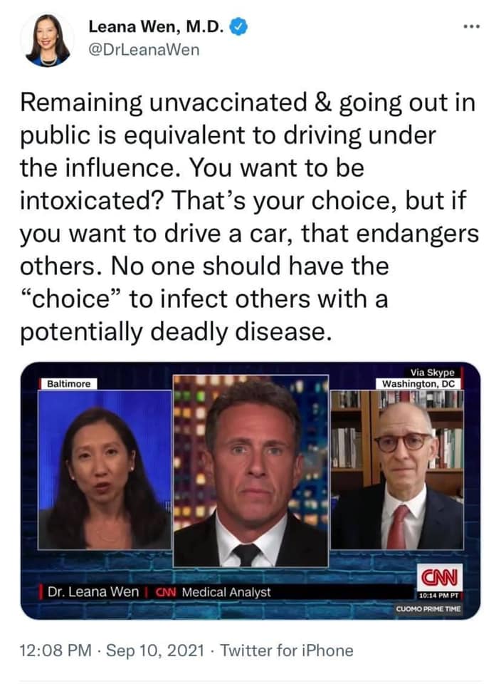 “Chiên da phân tích y tế” hàng đầu của CNN là Bác Sĩ Leana Wen đã lên tiếng về chỉ thị bắt buộc phải chích ngừa của chính quyền liên bang “Tổng Thống” Biden đối với gần 100 triệu người Mỹ trong tuần này. Cô còn so sánh trực tiếp những người không chích ngừa “khi đi ra những nơi công cộng” với “lái xe khi say xỉn”.
