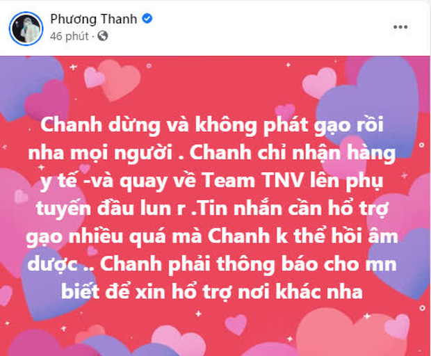 Ca sĩ Phương Thanh cũng đưa ra thông báo dừng phát gạo cho người có hoàn cảnh khó khăn trong mùa dịch ở TP.HCM. Nữ ca sĩ cho biết sẽ quay về làm tình nguyện viên ở tuyến đầu.