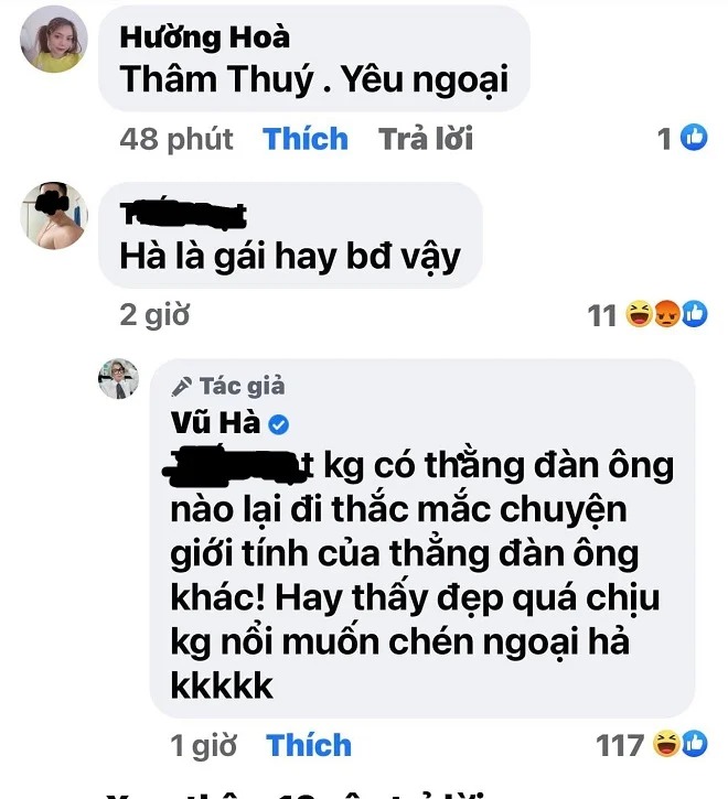 Một người khác lại comment: "Hà là gái hay bê đê vậy"? Vũ Hà trả lời: "Không có thằng đàn ông nào đi thắc mắc chuyện giới tính của thằng đàn ông khác. Hay thấy đẹp quá, chịu không nổi, muốn chén ngoại hả"?