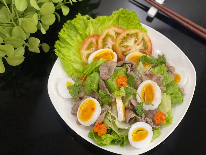 Vị ngọt thịt bò, vị béo của trứng lòng đào quyện vào xà lách tươi giòn, nước sốt chua ngọt khiến món salad hài hòa, thanh mát.