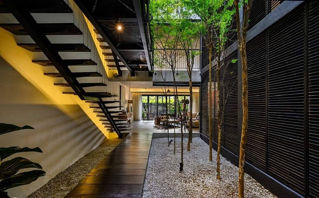Không chỉ có vườn cây, trục giao thông chính là ngôi nhà là cầu thang cũng được đặt tại khu vực thông tầng này. Cầu thang được làm bằng gỗ sơn đen, hòa quyện cùng tay vịn cầu thang kim loại, mang đến sự kết hợp vừa cổ điển, vừa hiện đại.