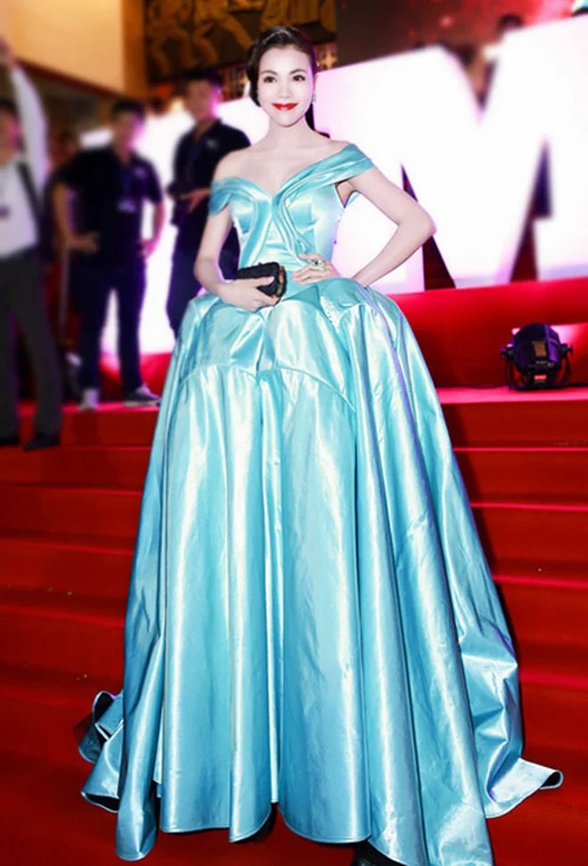 Trà Ngọc Hằng là người đẹp có đức tin bất diệt ở những mẫu đầm cồng kềnh như cho 2 người mặc. Dẫu mẫu thiết kế không đẹp nhưng được cái với dáng đầm quá khổ thế kia cô di chuyển loạng choạng cũng không ai biết.