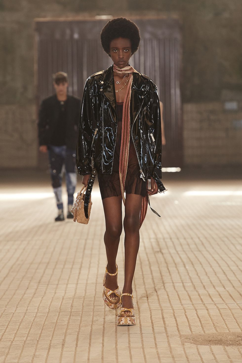 Các trang sức trái tim và bướm lấp lánh, mặt dây chuyền trái cây và vương miện thủ công tôn lên dáng vẻ của người mẫu khi bước trên sàn catwalk. Họ đeo túi trái tim in họa tiết da báo, đi giày cao cổ và dép đế bệt giúp họ vững vàng trên sàn diễn.