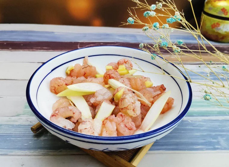 Tiếp theo, sơ chế tôm. Tôm bóc vỏ, bỏ chỉ đen, rửa sạch, để trong bát. Thêm 0,5g muối, 5g hành lá xắt nhỏ, 3g gừng băm nhỏ, khoảng 0,3 g bột hạt tiêu và 5g rượu nấu ăn, trộn đều. Ướp trong 30 phút, tôm vừa ngon và bớt tanh.