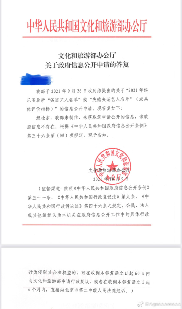 Văn bản này nêu rõ: "Vào ngày 26/9/2021, chúng tôi có nhận được đơn của bạn về việc công bố thông tin liên quan đến 'Danh sách nghệ sĩ ô danh', 'Danh sách nghệ sĩ thất đức trong làng giải trí 2021'. Câu trả lời của chúng tôi là như sau: Sau quá trình kiểm tra, Bộ Văn hoá và Du lịch chưa từng thành lập danh sách, chưa từng nhận được các thông tin mà bạn chia sẻ, tin tức được cho là của chính phủ cũng không hề tồn tại".