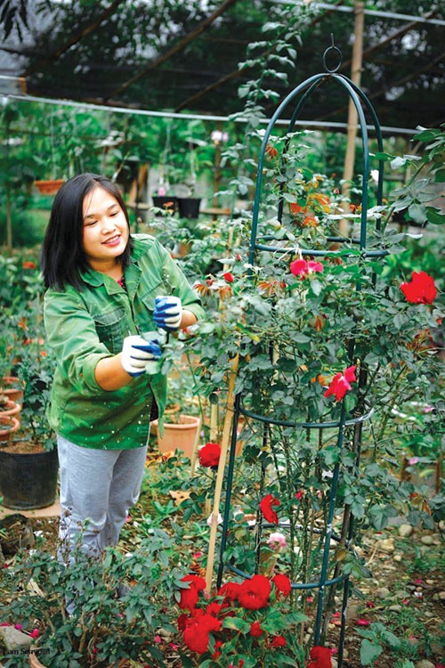 Khác với cô chanh dây e ấp, những nàng hồng rực rỡ xòe bộ váy đủ màu phô hết vẻ đẹp như muốn vạn vật phải cất lời ngợi ca. Chả thế mà chúng có danh xưng nữ hoàng của các loài hoa. Hồng nhung đỏ đậm, tường vy hồng phớt vương lòng người bởi mùi thơm thoang thoảng dễ chịu. Chị em hồng lửa kề nhau san sát tạo thành một thảm hoa đỏ rực, tuy không thơm nhưng nở lâu và bền màu.