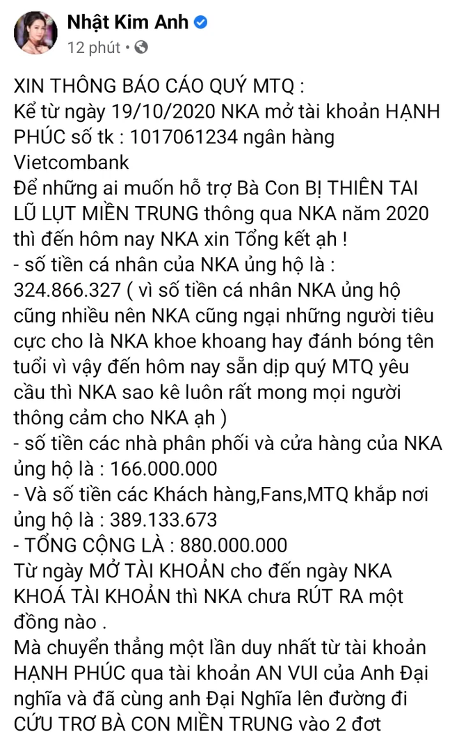 Và không để mọi việc đi quá xa, ca sĩ kiêm diễn viên Nhật Kim Anh đã có phản hồi chính thức về vụ việc. Theo đó, nữ ca sĩ tổng kết số tiền mà cô đứng ra kêu gọi là 880 triệu đồng, trong đó có hơn 324 triệu đồng là tiền đóng góp cá nhân của Nhật Kim Anh.