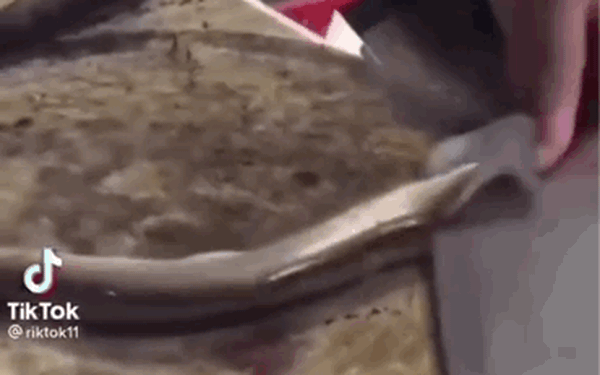 Theo đó, đoạn clip dài 12 giây ghi lại cảnh một con rắn (hoặc cũng có thể là lươn) đang nằm gọn trên thớt. Thanh niên làm bếp ngay sau đó đã trổ tài phi lê, róc thịt ra khỏi phần xương. Tuy nhiên, điều khiến ai nấy cũng sốc đó là con rắn ngay lập tức "giật ngược hồi sinh", trở mình lại và cắn vào tay người làm bếp.