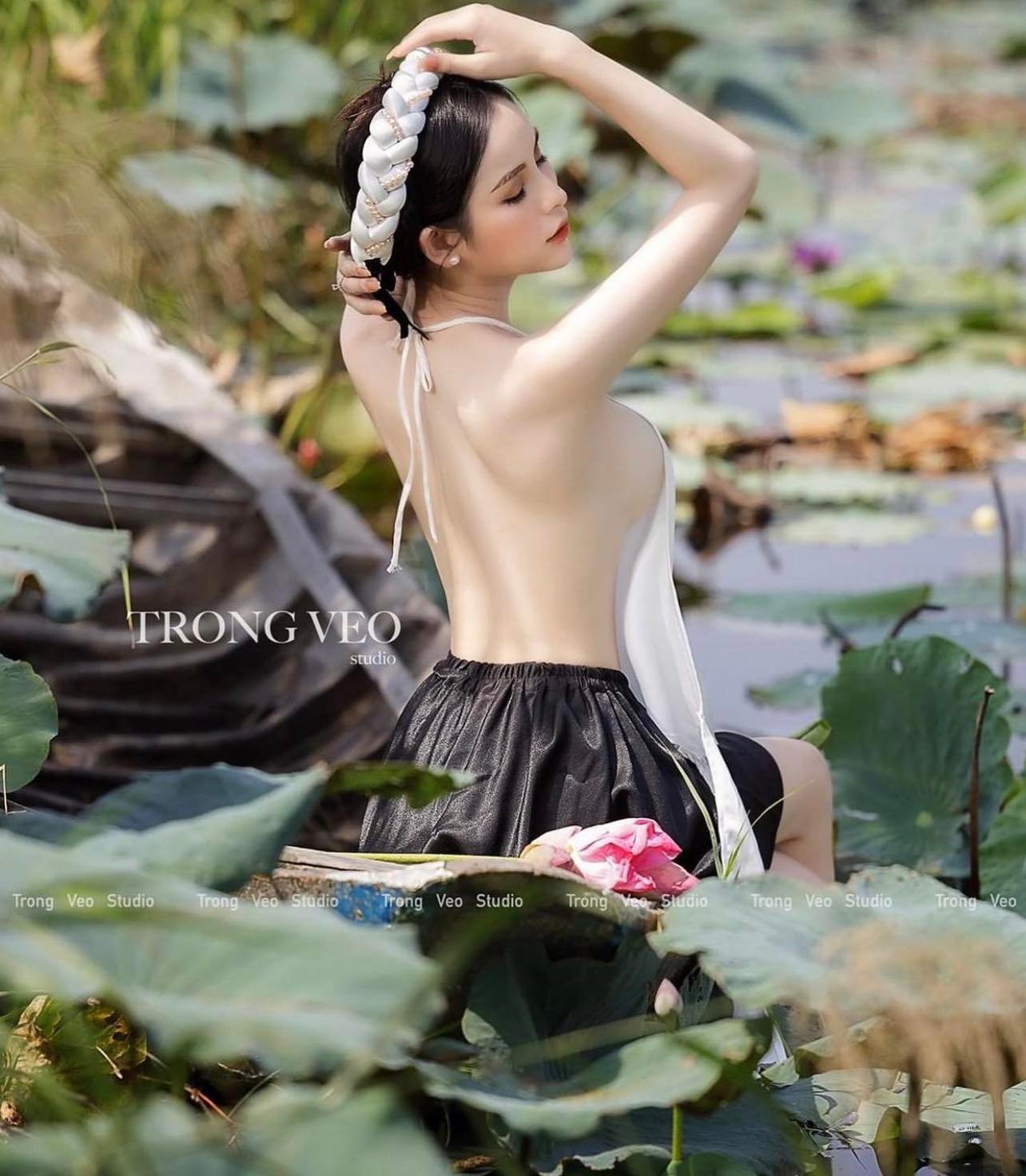 Cô thả áo yếm buông lơi, khoe lưng trần gợi cảm giữa hồ sen. Dù hình thể cân đối và nhan sắc xinh tươi nhưng hình ảnh này của Tường Vi dễ tạo nên tranh cãi giữa 2 thái cực phản cảm và gợi cảm.