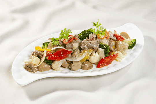 - Cho bò xào nấm ra dĩa, rắc mè trắng rang lên trên. Dọn kèm nước tương “Phú Sĩ” và ớt cắt lát.
