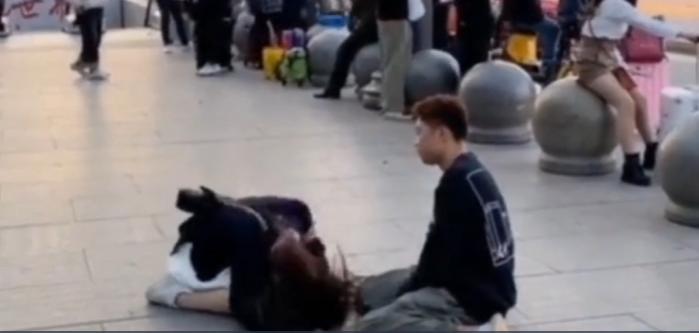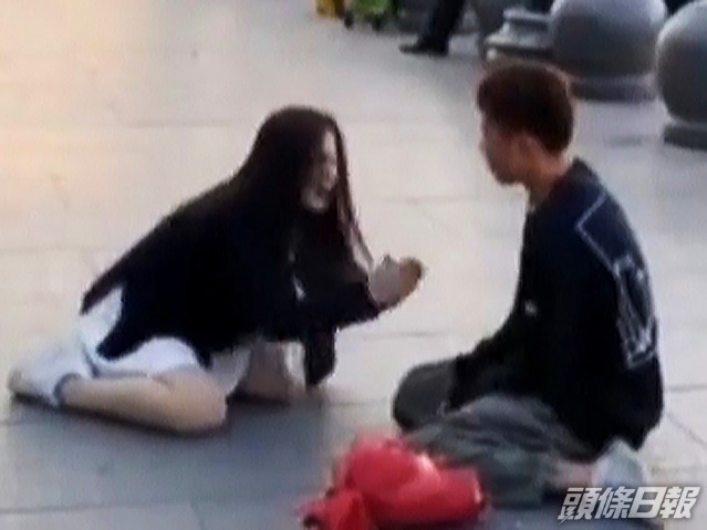 Cô gái đã quỳ rạp xuống nền đất giữa khu vực công cộng và liên tục chắp tay vái lạy chàng trai. Cô gái vừa khóc vừa lên tiếng cầu xin: "Xin hãy buông tha cho tôi." Tiếng khóc to và hành động này đã thu hút không ít sự chú ý của nhiều người xung quanh.