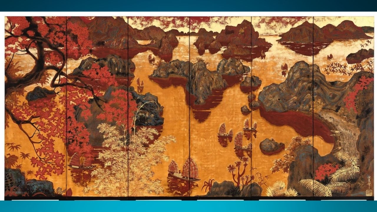 Theo gia đình nghệ sĩ Phạm Hậu cho biết, các tác phẩm được lấy cảm hứng từ Vịnh Hạ Long của ông rất ít ỏi. Đây là tác phẩm thứ hai được biết cho đến nay, nhưng nó có quy mô và chất lượng vượt xa tác phẩm đầu tiên khi khung cảnh của Vịnh Hạ Long được thể hiện qua tông màu rực rỡ đầy mê hoặc như vàng kim và đỏ – màu sắc tượng trưng cho triều đình.