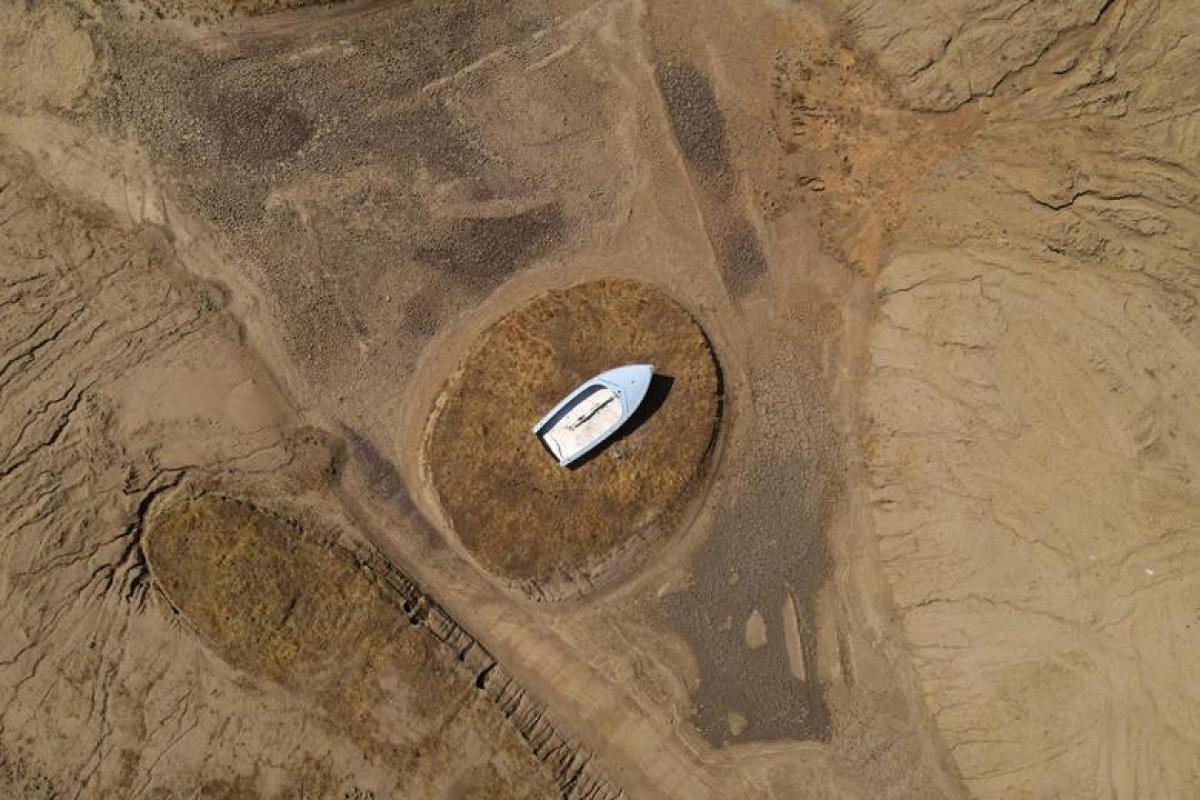 Một con tàu nằm chơ vơ trên mô đất gần hồ Hensley khi nhiệt độ tăng cao dẫn tới hạn hán làm các sông hồ ở Madera, California bị cạn nước. Bức ảnh chụp ngày 14/7/2021.