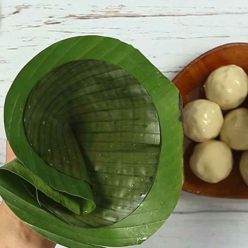 Tiếp theo, bạn lấy một tấm lá chuối (đã được cắt thành hình tròn) xếp thành hình phễu rồi bỏ bánh vào bên trong. Cuối cùng, bạn gói các mép lá lại là xong.