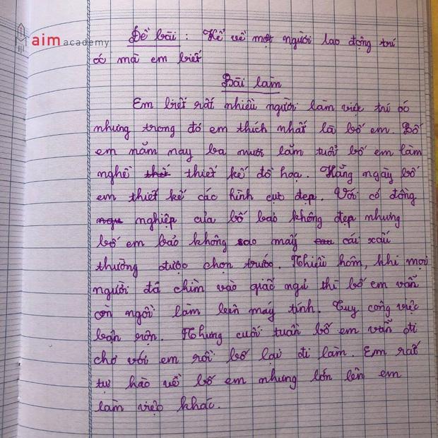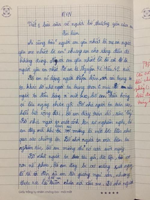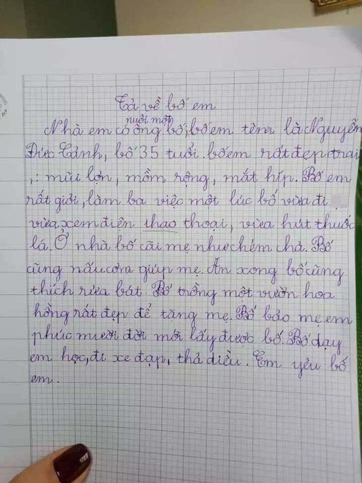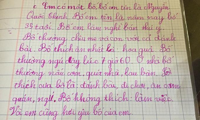 Nguyên văn bài tả thực về bố: "Bố tôi tên là Nguyễn Trọng Hùng. Bố tôi 33 tuổi. Bố tôi rất lười và hay uống bia, rượu. Bố tôi khiến mẹ tôi mệt mỏi vì cái tội lười và ham chơi. Thế nên tôi mới không thích bố tôi vì quá lười". Màn bêu rếu nhưng thật như đếm của cậu nhóc, hi vọng người bố sẽ sớm chấn chỉnh lại.